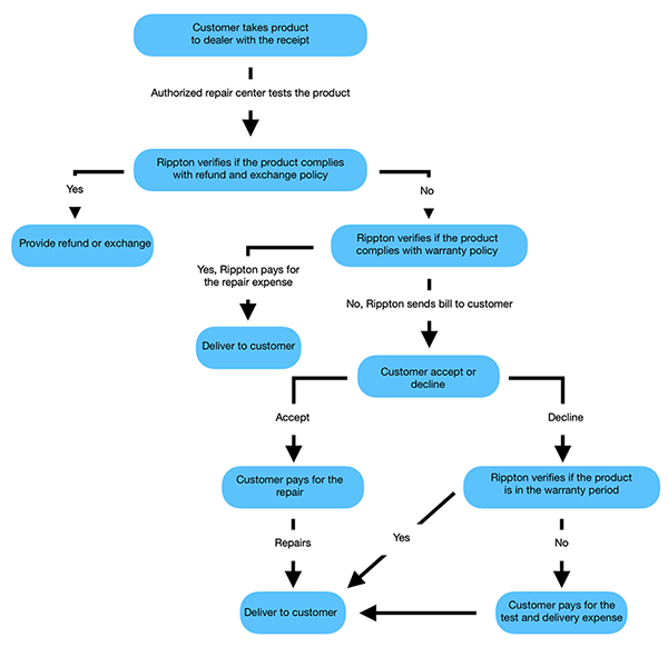Rippton will examine the returned product(s) to identify the problem. If the problem meets the service standards under this policy, Rippton will cover the cost for refund, replacement, or repair and return the product(s) to you.